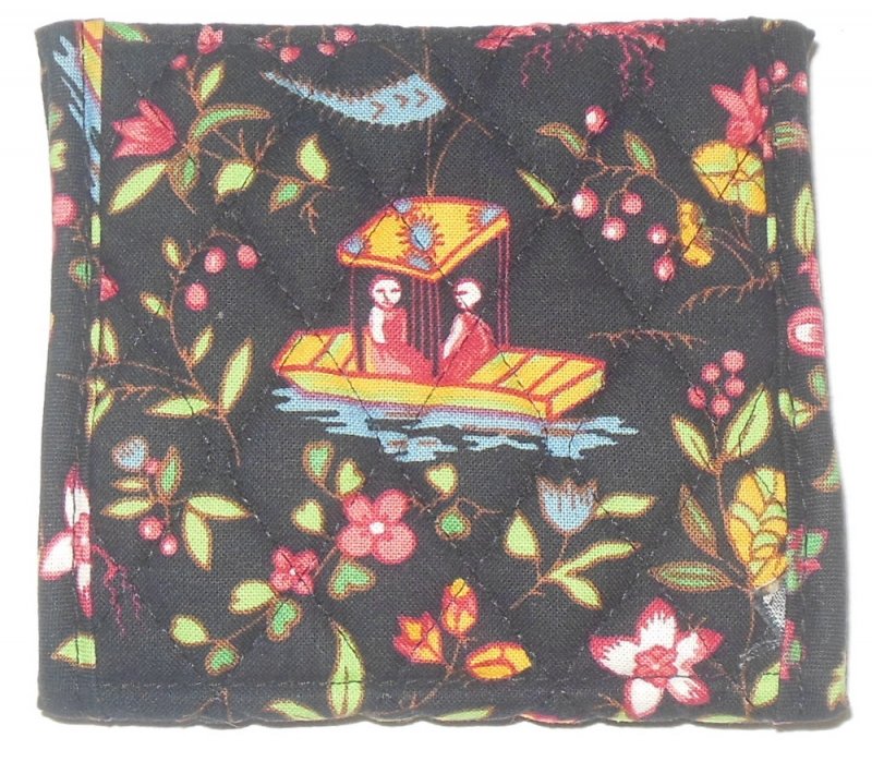 Colorful oriental pattern over a black background. The detailed pattern consists of Japanese Asian theme with flowers and green leaves with people including a Japanese boat on the backside of the wallet.